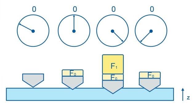 1. Dijamantni penetrator u obliku stošca prisloni se uz površinu uzorka i aplicira se pred opterećenje silom F0. Pritom dolazi do male indentacije i tada nuliramo poziciju mjerača dubine.